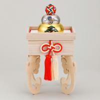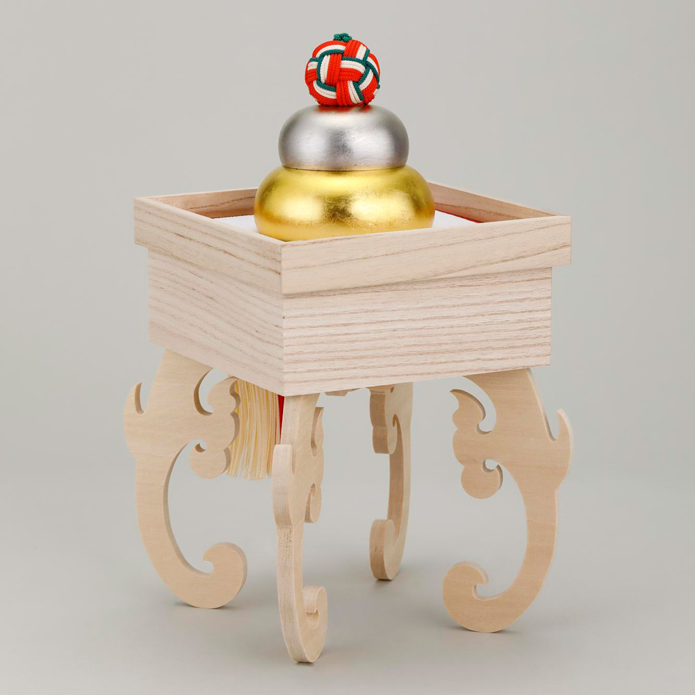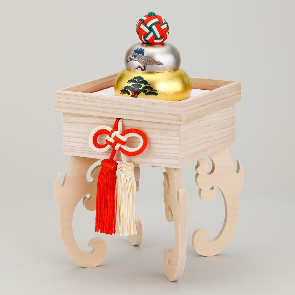 日本の伝統的な素材と技術を活かし新春のめでたさを表したお正月飾りです。漆器に漆で文様を描き乾かないうちに金粉などの金属粉を蒔いて文様に定着させる、蒔絵の技法で鶴や松などの縁起のよい文様が描かれています。ダイダイは絹の唐打紐を「亀結び」して、魔除けと長寿と富貴を象徴しています。桐材でつくられた外箱を三宝としてご使用、雲に見立てた脚をセットして取り付けます。出番が終わったら、大きい餅の中に小さな餅、ダイダイをコンパクトに収納することが出来ます。