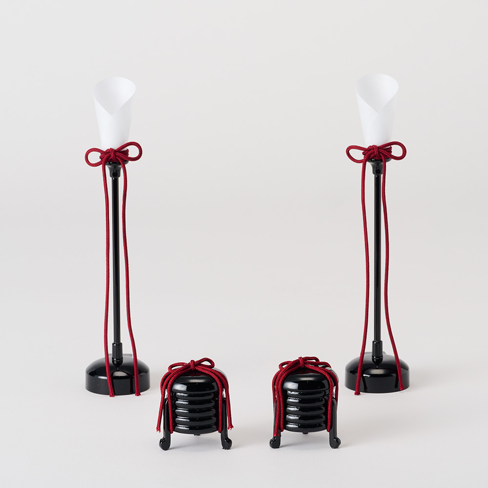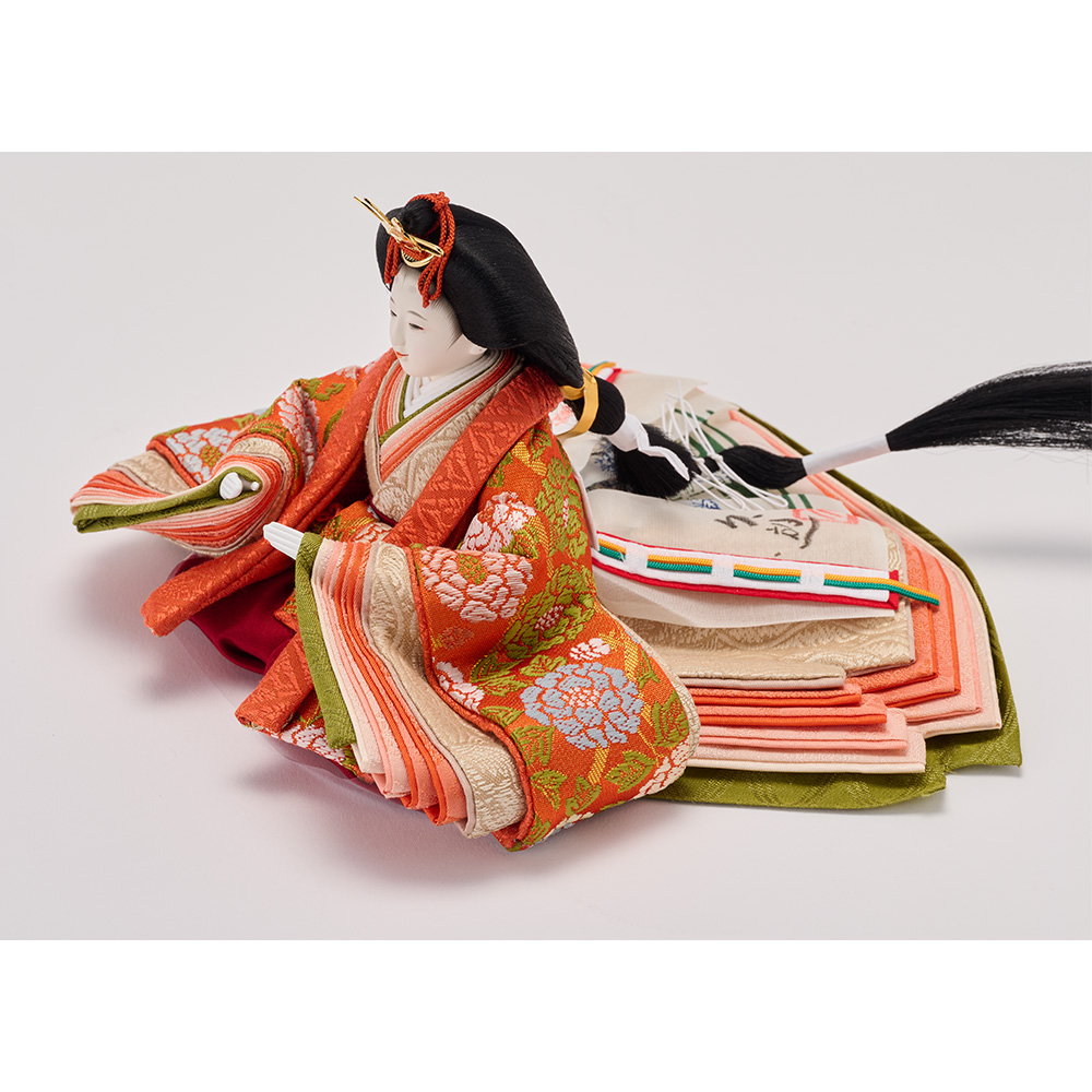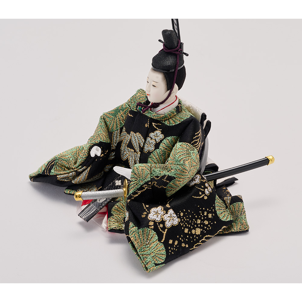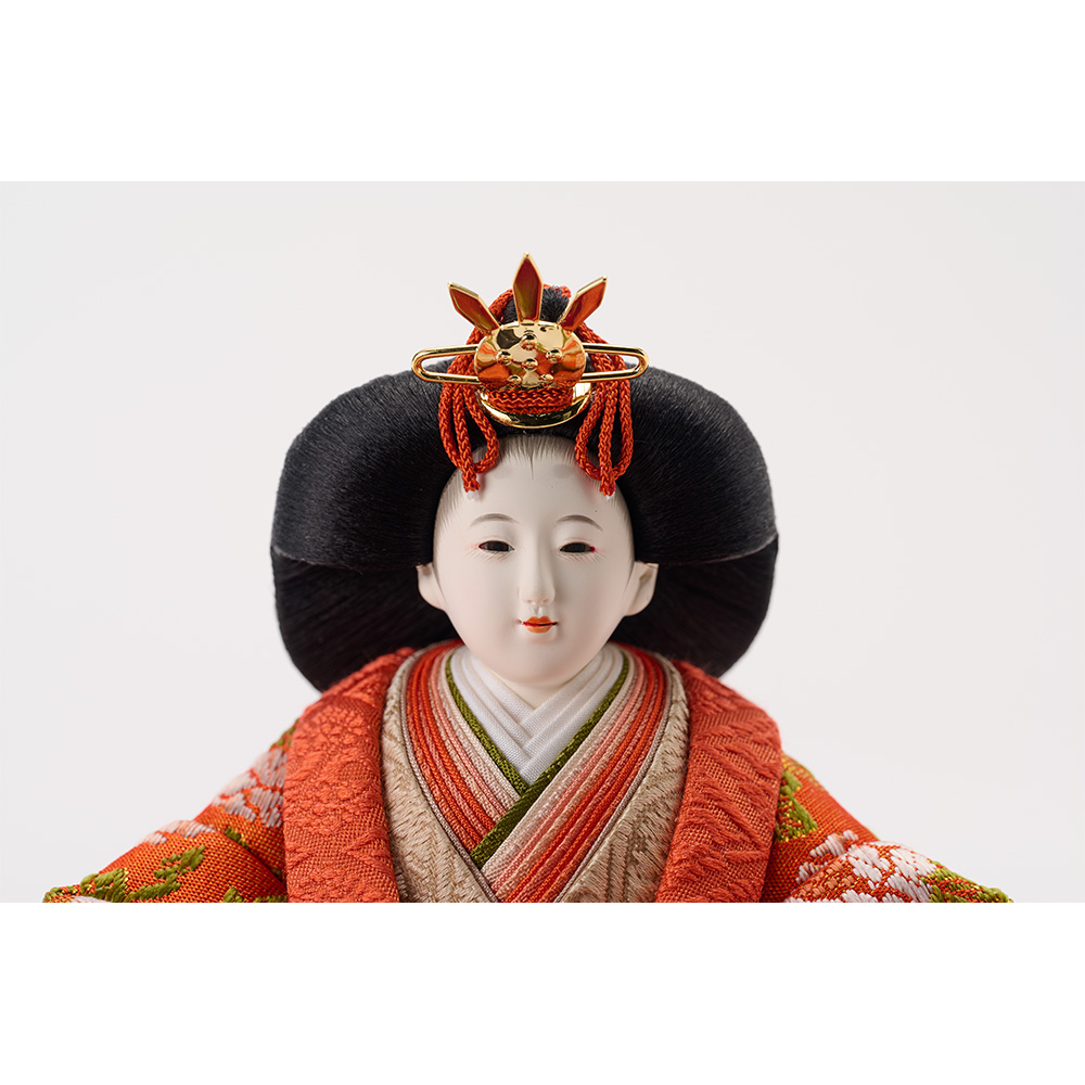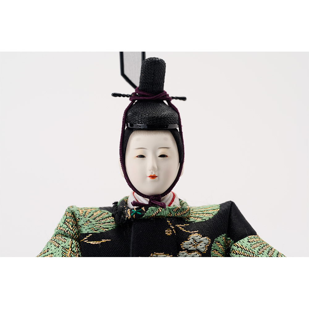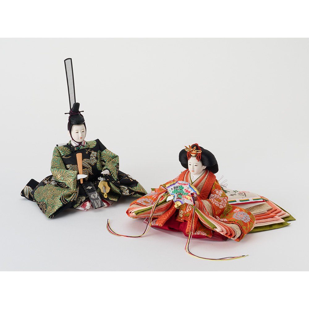 男雛の衣裳は「松竹梅」、女雛の衣裳は「牡丹唐草」文様です。どちらも吉兆を表現するもので、幸せな未来への願いを込めました。