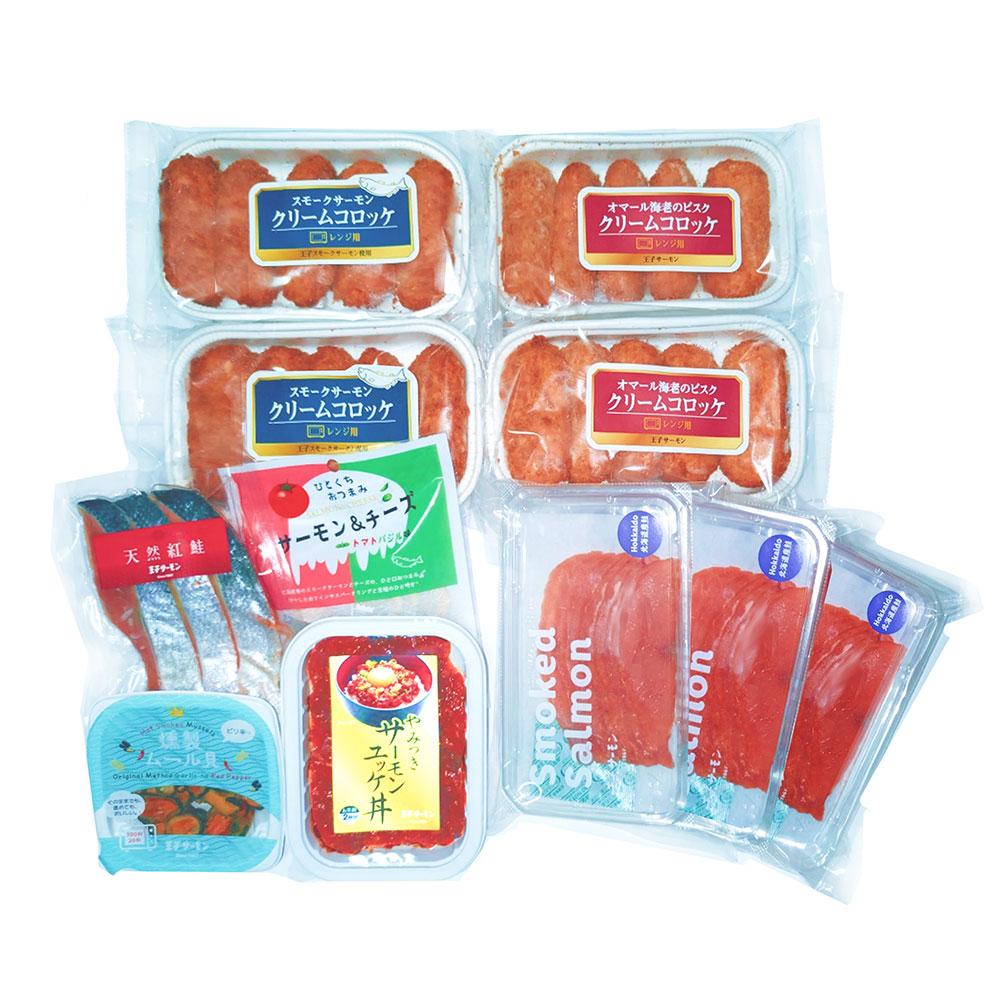 北海道産 鮭スモークスライス 各50g×3、燻製ムール貝 50g×1、サーモンユッケ丼 80g×1、サーモン&チーズ(バジル)×1、スモークサーモンクリームコロッケ(レンジ用)×2、オマール海老のビスククリームコロッケ(レンジ用)×2、カッパリーバー塩紅鮭切身(甘塩味)3切×1