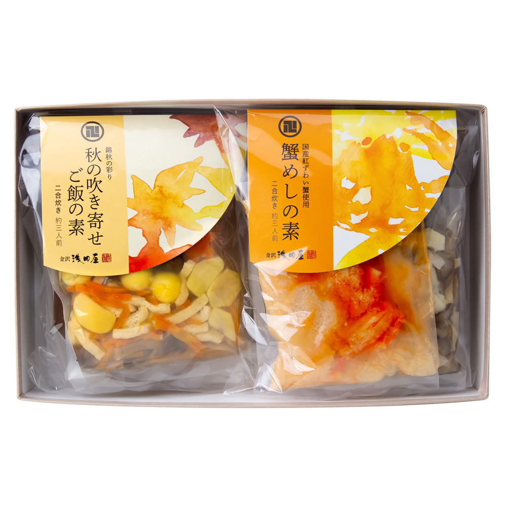 慶応3年創業、金沢を代表する料亭旅館「浅田屋」。国産の紅ずわいがにの身を鰹と昆布だしで香ばしく炊き上げる「蟹めしの素」と、照葉が散り敷く秋の山里の彩りを栗や銀杏にしめじ、紅葉をかたどった人参などの具材で表現した「秋の吹き寄せご飯の素」を詰合せしました。