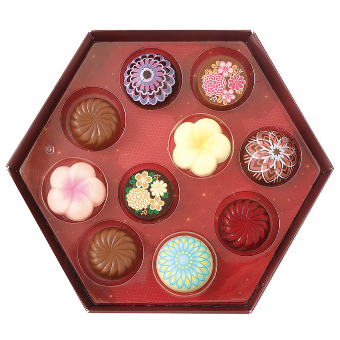 花飾りをイメージした「京かざりショコラ」と手毬をモチーフにした「京あそびショコラ」のアソート