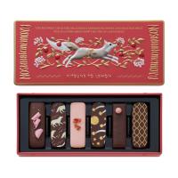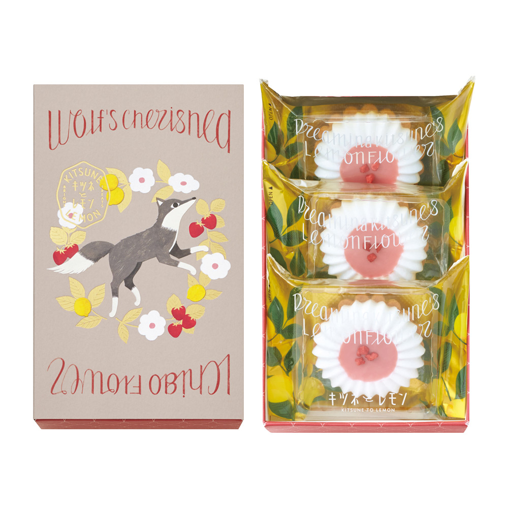 恥ずかしがり屋のオオカミとキツネとの出会いから生まれた、味わいをお届けします。<オオカミの憧れイチゴフラワー>「オオカミの憧れは甘酸っぱくて、可愛いあの赤い実。小さくて、ツヤツヤ赤くて、きゅんとくる。だんだん赤く熟れていくその実は恥ずかしがり屋のオオカミと似ているね。」さくさくのバタークッキーに、レモン果汁入りの軽やかなメレンゲクッキーを合わせた可憐なお菓子。イチゴのチョコレートを使用した優しい甘さのイチゴクリームに、カリカリとした食感も楽しいストロベリーキャンディをトッピングしました。<オオカミのノスタルジックメモリー>「森の中、動物たちに囲まれるキツネを見かけたオオカミ。なんと、ふたりは姿かたちがそっくり。みんなと楽しそうなその姿に、オオカミは、仲間に入りたいな、と秘かに憧れて…。」オオカミとキツネが出会うまでの物語をイメージしたチョコレートを、そっと缶に詰め合わせました。2026年限定カラー缶です。ときめく赤い実(いちご)、真っ暗闇のほら穴(カフェオレ)、とっておきのご馳走(ダブルイチゴクリーム)、とろける満月(ハニーキャラメル)、イチゴ畑をわたる風(ストロベリーシャンパン)、オオカミの憧れの香り(レモン)。<ブランド説明>「あるときキツネがレモンをくわえてやってきた」すっぱいもの好きの、ちょっと変わったキツネが届けるキュンととろける甘酸っぱさ。心を明るく灯す、黄金の実「レモン」にまつわるお菓子。