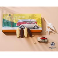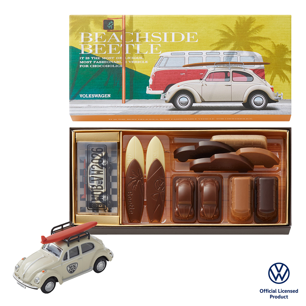 カリフォルニアの海岸沿いに集うビートルやバスをイメージしたアソートです。サーフボード型のチョコレートには、遊び心あふれるオリジナルデザイン入り。サーフボードを載せたアイボリーのビートルミニカー付きです。