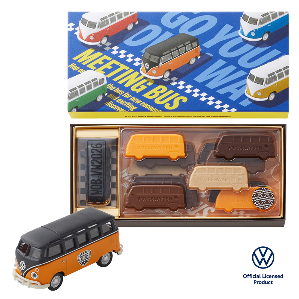 バスのシルエットのプレート型チョコレートがレイヤー状に並び、仲良く連れ立ってドライブしているようなひと箱。スイート、ミルク、ミルクティー、オレンジの4つの味わいをお楽しみいただけます。