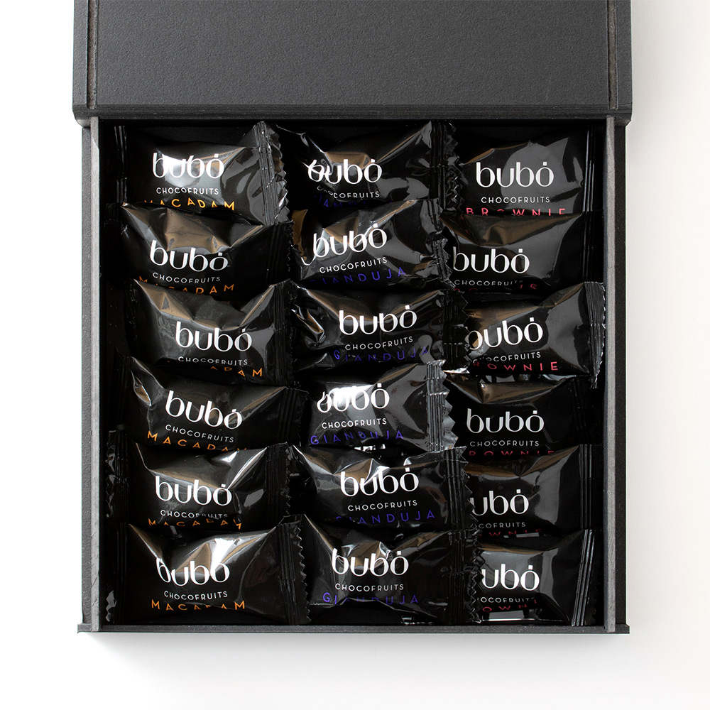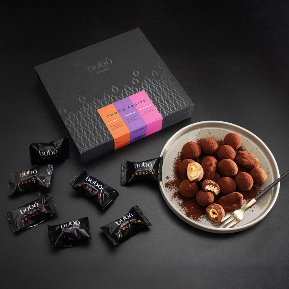 「繊細な味わいと美しさ」を兼ね揃えた、スペインを代表するチョコレートブランド「ブボ・バルセロナ」。ブランドを代表するチョコレート「チョコフルーツ」を一粒ずつ贅沢に包んだアソートボックスです。スタイリッシュなボックスに、人気フレーバー「マカダム」「ジャンドゥーヤ」「ブラウニー」の3種類を詰め合わせました。大粒のナッツをチョコレートでコーティングし、ナッツとチョコレートの絶妙なバランスがやみつきになる逸品。贈りものやお手土産にもぴったりな一箱です。「マカダム」と「ジャンドゥーヤ」は、インターナショナルチョコレートアワード2020銀賞を受賞。