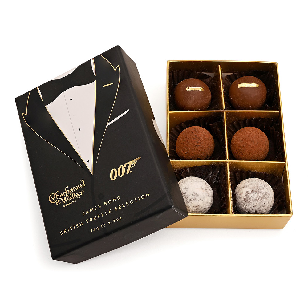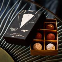 タキシードのジェームズボンドをイメージしたおしゃれなタキシードボックス。ミルクソルトキャラメルトリュフ、ミルクバニラトリュフ、金箔をあしらったミルクヘーゼルナッツクリームトリュフの3種各2個のアソート。