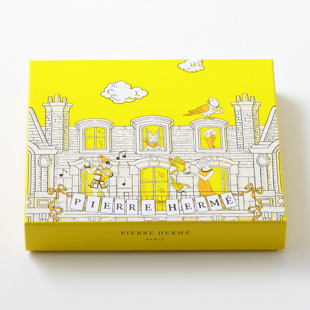 ショコラはピエール・エルメの大好きな素材のひとつ。「パティスリー界のピカソ」と称される彼のショコラには、独特の輝き、まろやかさ、芳香があります。口の中でソフトにとろける上質なショコラに、「アンフィニマン プラリネ マイス」「ショコラ オ レ エ テ マッチャ」が登場。フランス在住のイラストレーター、ジュリー・セールが描くアール・ド・ヴィーヴルに彩られた限定BOXでお届けいたします。