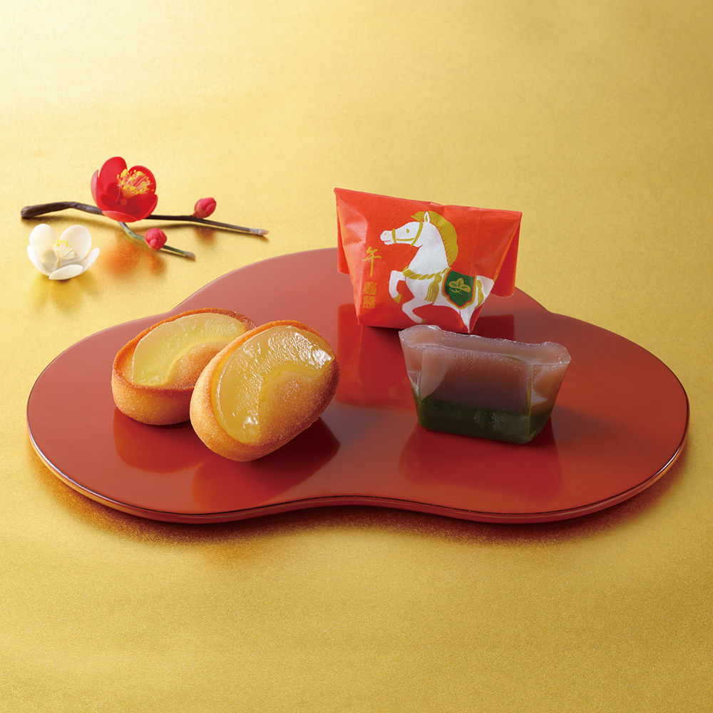 香り豊かな抹茶羊羹に、白あんと小豆こしあんを練り合わせた半小豆羊羹を重ねた「干支羊羹 午」。アーモンドとコクのあるバターの風味を生かした生地に、瑞々しい白桃をあしらった「白桃フィナンシェ」。2種類のお菓子が可愛らしい絵馬型のお箱に入っております。「絵馬福招来」の蓋は、絵馬としてお使いいただけます。※こちらは同じ商品を2箱セットでお届けいたします。
