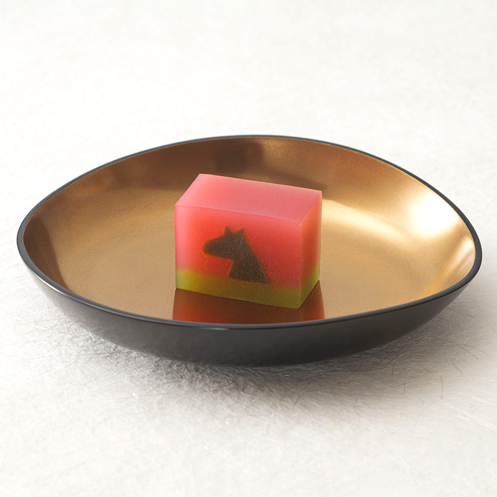 希望に向かって千里を駆ける駿馬の姿をあらわした吉例の意匠羊羹「春千里」にほんのり黒糖風味をしのばせ、午の干支の吉兆をこめ謹製いたしました。