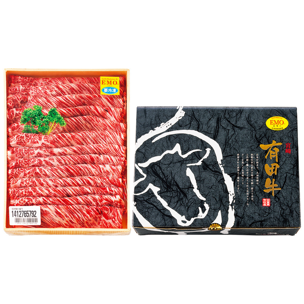 宮崎県の有田牧場で、水やエサにこだわり心を込めて育てた黒毛和牛「有田牛」の肩ローススライス。すき焼きやしゃぶしゃぶでどうぞ。