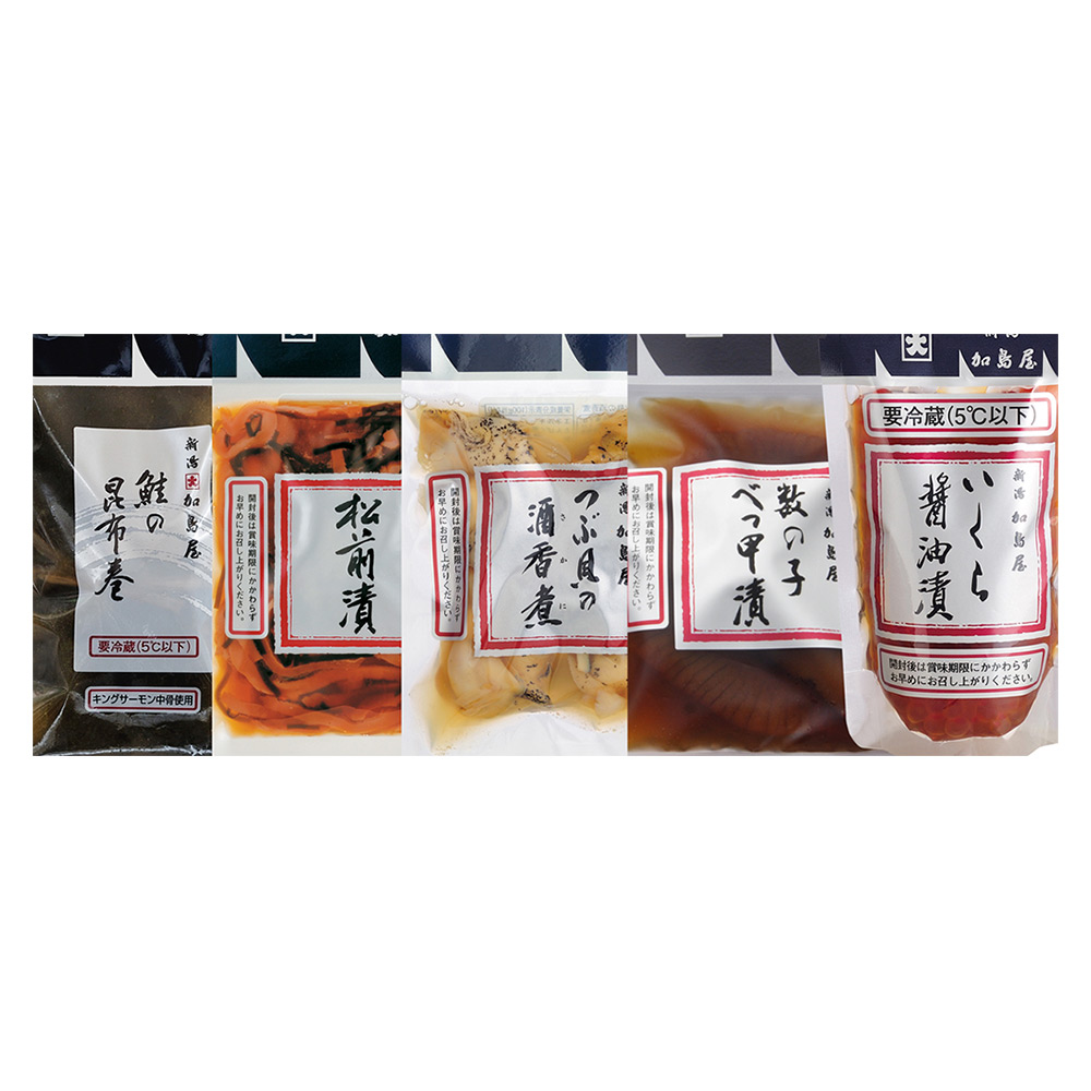 キングサーモンの中骨を昆布で巻き、醤油・だし汁などでじっくり煮込み、やさしい味わいに仕上げたお正月には欠かせない新潟の郷土料理「鮭の昆布巻」のほか、北海道沿岸で漁獲される秋鮭の卵を丁寧にほぐし、醤油・清酒などに漬け込んだ「いくら醤油漬」、カナダ太平洋側で漁獲されるにしんの卵を伝統的な製法で数の子に仕上げ、醤油・みりんなどに漬け込んだ「数の子べっ甲漬」、本乾のするめと昆布に数の子を和え、醤油等に漬け込んだ「松前漬」、天然のつぶ貝を酒と醤油で炊き上げた「つぶ貝の酒香煮」、バラエティー豊かな迎春向け5品の詰合せです。