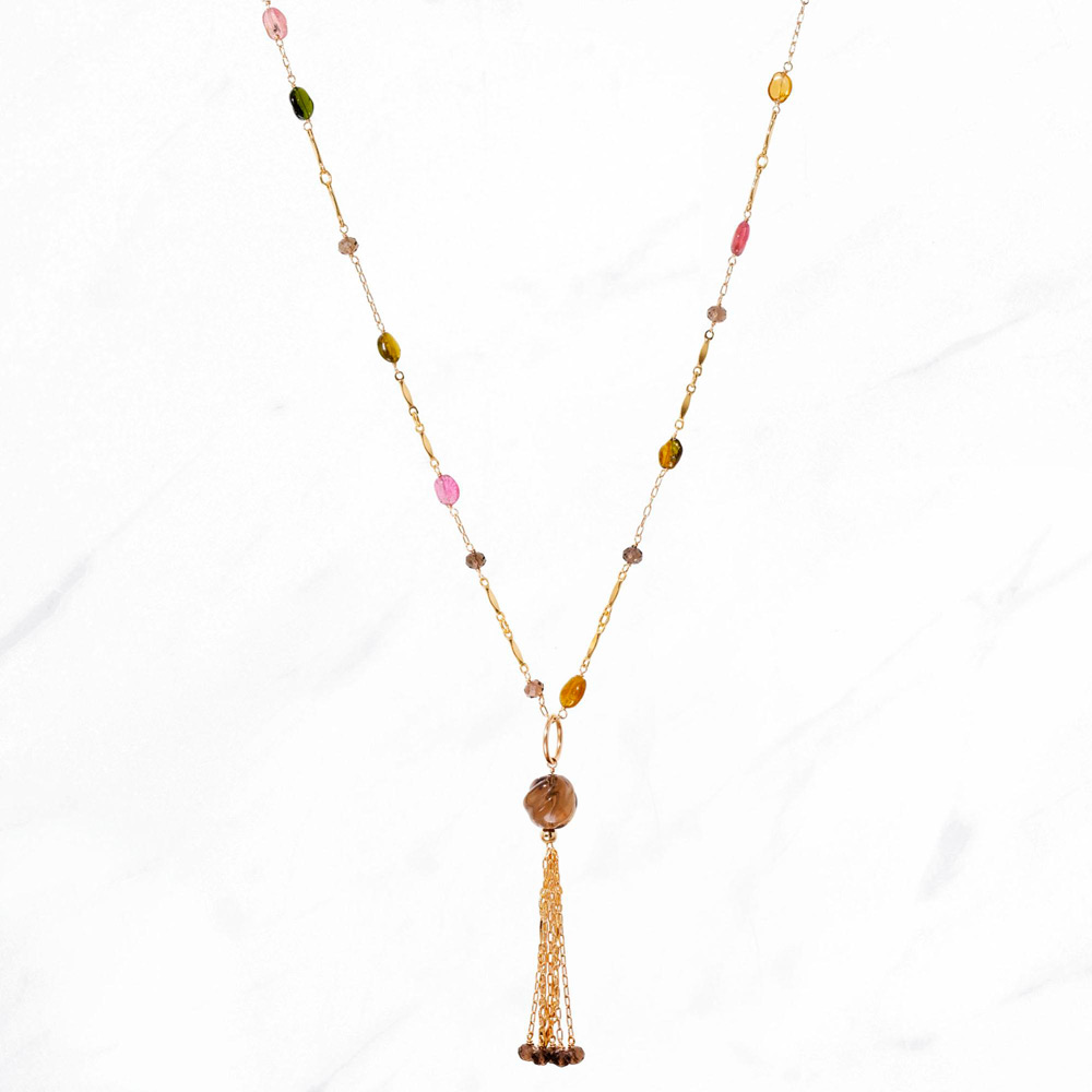 トルマリンの幅広い色彩を存分に生かし、アンティーク感のあるデザインチェーンと組み合わせたリッチなネックレス。民族調のボヘミアンと、都会的でスタイリッシュなSOHOスタイルをミックスさせたBOHOテイストに仕上げました。 スモーキークオーツのタッセルチャームは取り外しが可能なので、気分に合わせたスタイリングが楽しめます。