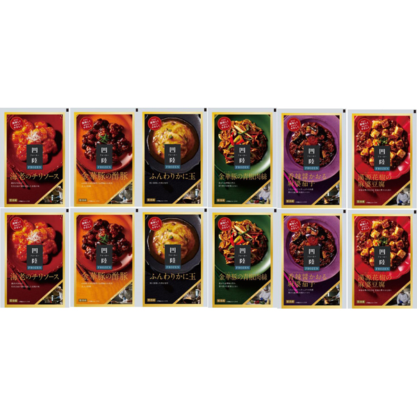 海老のチリソース150g・金華豚の酢豚150g・ふんわりかに玉185g・金華豚の青椒肉絲150g・ 漢源花椒の麻婆豆腐180g・香辣醤かおる麻婆茄子180g 各2袋 計12袋