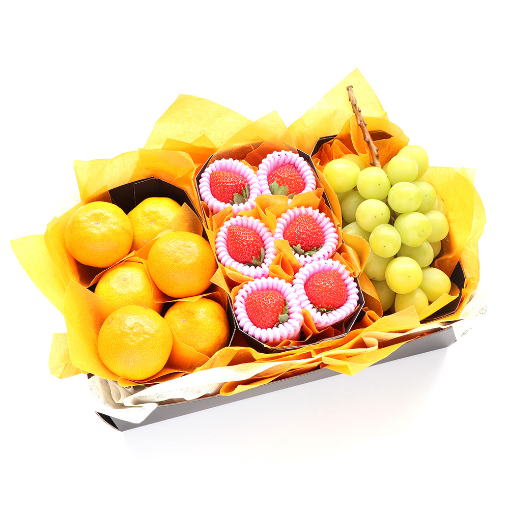 マスカットの高貴な香りと甘さをお楽しみいただける「シャインマスカット」と甘さと酸味のバランスの取れた「いちご」、しっかりした甘さの冬みかんを詰め合わせたフルーツギフトです。ナイフを使わずに召し上がれるフルーツの詰め合わせですので、果物は皮を剥くのがめんどうという方へもおすすめのギフトです。※商品説明リーフレットを同封いたします。