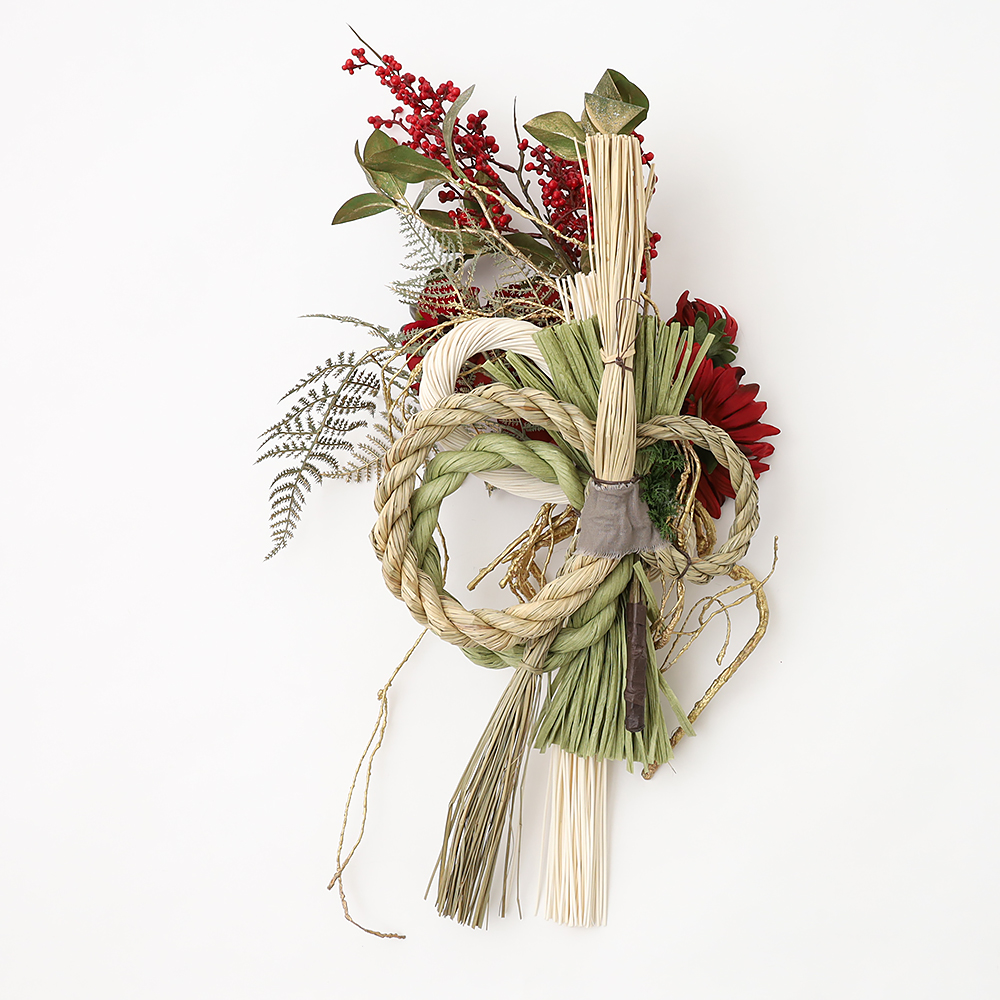 【アートフラワー】ゴボウ締めとラタン締めに赤の蘭と大輪の菊を合わせた迎春飾り