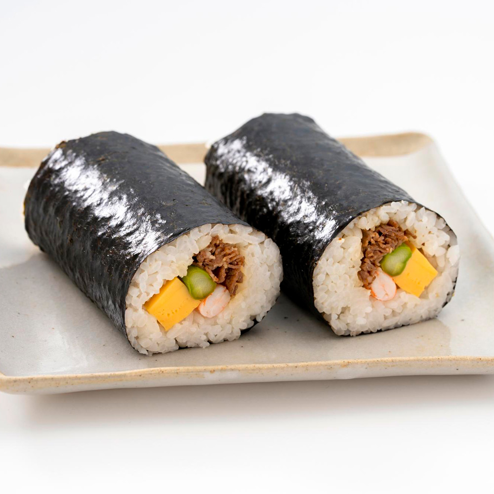 ゆしま扇の手巻きの恵方巻。今回は牛肉うま煮、こだわりの玉子焼と海老、お子様から大人まで楽しめる味わいの恵方巻。仕出し料理屋の恵方巻をお楽しみください。