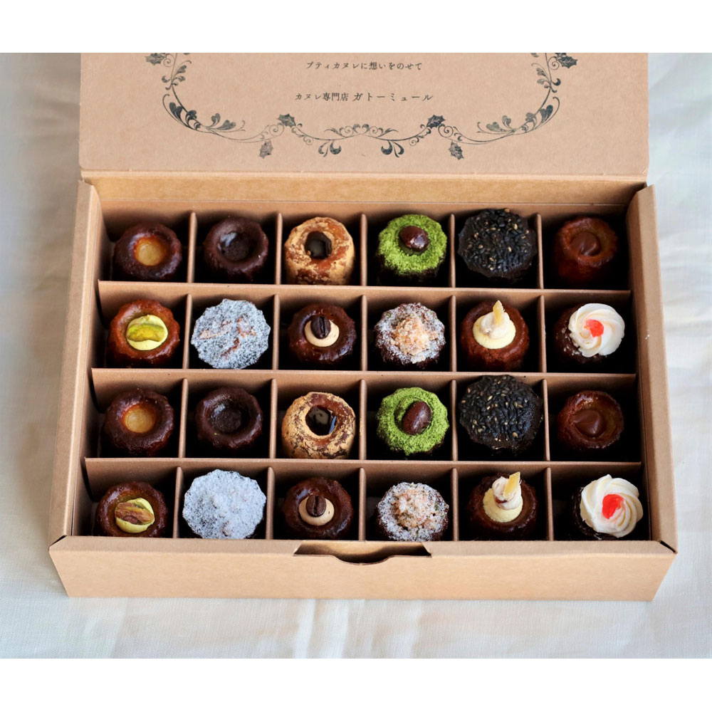 ミニカヌレ24個入(西尾の抹茶、黒蜜きな粉、黒糖とくるみ、黒ごま、キャラメル・サ・レ、バナーヌ、ピスタチオ、せとか、フルール、カフェ、バニーユ、ショコラ 各2個)