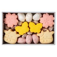 オリジナルのクッキー缶の中に、ヨーグルトパウダーと桜ソースを使用した「さくら」とヨーグルトパウダーとバニラビーンズ入りの「蝶」のオリジナルクッキーを詰め合わせました。そのほかのクッキーもヨーグルトやホエイなどが入って爽やかな後味で軽い食感です。※桜柄のスリーブに入れてお届けします。