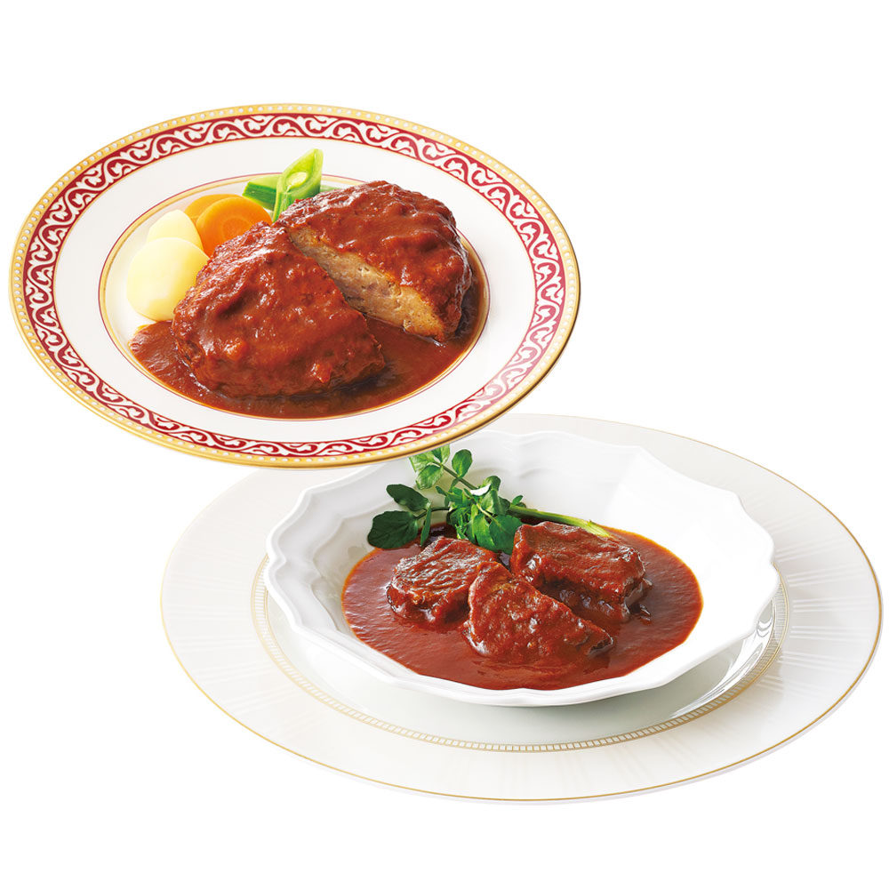 人気のハンバーグとビーフシチューを各2袋ずつ詰合せました。お試しに、お二人のディナーに好適です。
