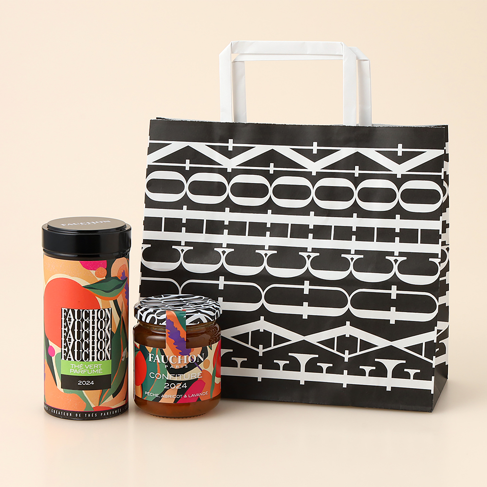 2024年イヤーティー(緑茶:ピーチ&アプリコット)90g、2024年イヤージャム(ピーチ&アプリコット)245g ※フォション手提袋1枚付
