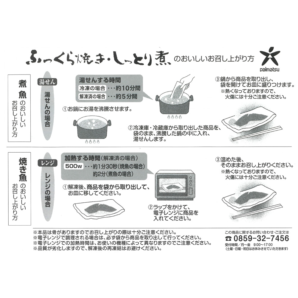 金目鯛と黄金生姜の煮付け約100g×2、さばと南高梅の煮付け約110g×2、豊後ぶりの照焼き約90g×2、山陰産のどぐろの煮付け約85g×2