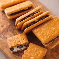 ほんのりメープルが香るバタークリームの中に、ラム酒がしっかり効いたレーズンがぎっしり。サクサクのサブレ生地でサンドしました。