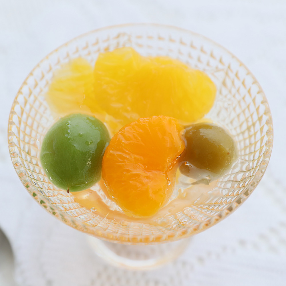 和歌山県産の梅の甘露煮、温州みかん、八朔(ハッサク)、若桃をジュレにそっと閉じ込めました。フルーツ王国和歌山ならではの、やさしい甘みとフルーツ本来の香りをご賞味頂ける一品です。