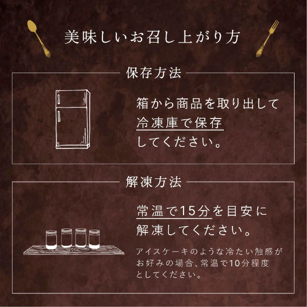 【冷凍便でお届けします。解凍まで時間がかかりますのでご注意ください。】<ショートケーキ>思わずほほも赤らむ、苺の輝き。赤と白のコントラストが美しい瓶スタイルならではの逸品。一つひとつ見栄え良くカットした苺をはじめ、独自クリームやしっとりとしたスポンジなど、シェフの美味しい技をご堪能ください。<チーズケーキ>2種のチーズが奏でる魅惑のシンフォニー。風味が異なるマスカルポーネチーズとクリームチーズが奥深い味わいを生み出す魅惑的なチーズケーキ。アクセントにアーモンドクランチと蜂蜜ソースを使い、仕上げには金粉を散らしています。<カシスモンブラン>栗の風味とカシスの甘酸っぱさの相性の良さが光る逸品。風味豊かな栗の味わいを引き立てるカシスのソース。フランスでもよく使われる相性の良い組み合わせをケーキにしました。ごろりとした渋皮栗の香ばしさとともに、芳醇でいて甘酸っぱい味わいをお愉しみください。<ザッハトルテ>モダンな装いも似合うショコラの王様。チョコレートの濃厚な風味と、アプリコットとパッションフルーツをあわせたジャムの爽やかさ。伝統的なザッハトルテの味わいを大切にしながら、スタイリッシュでモダンな一品に仕上げました。