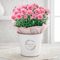 鉢植えカーネーションミルキーリップ。アンティーク風のブリキカバーに入れてお届けします。