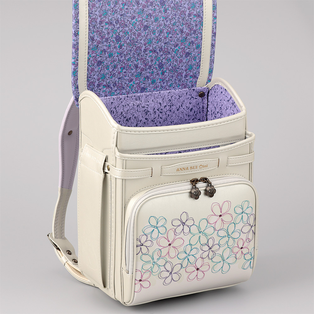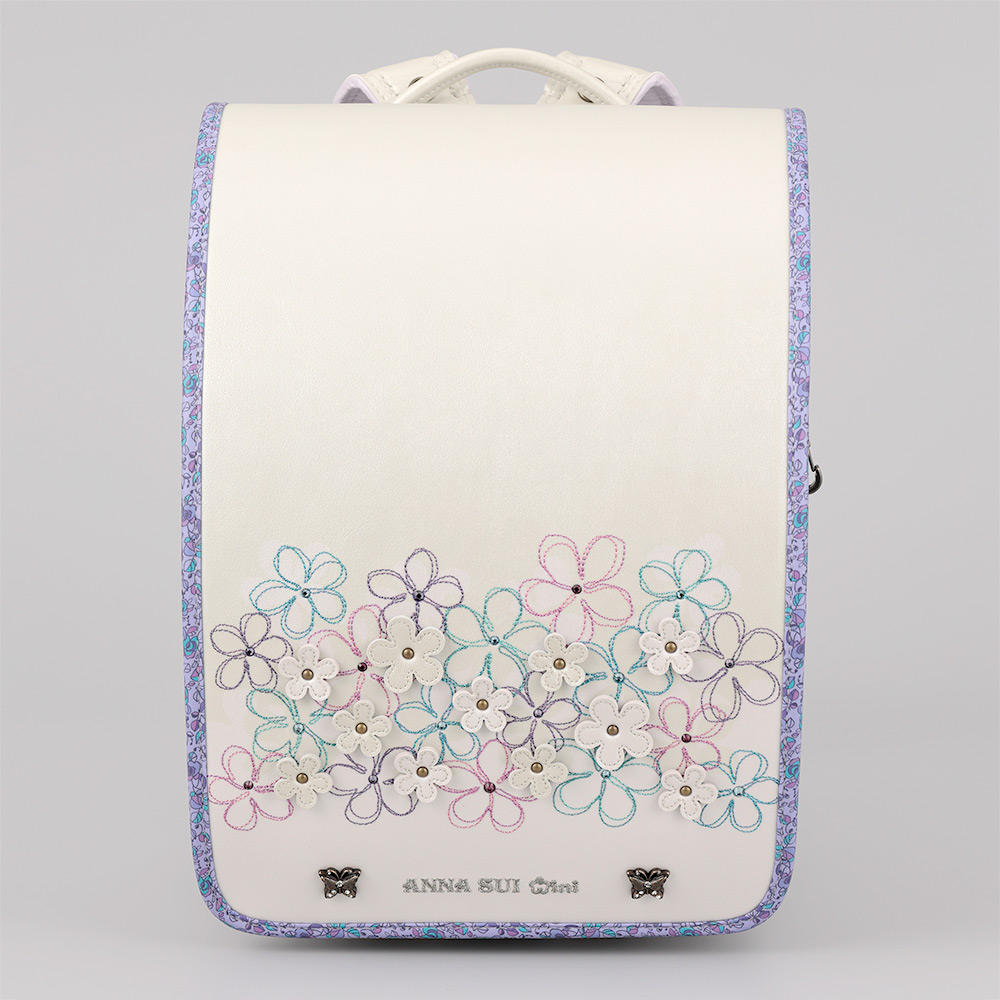濃淡の異なる二つの刺しゅうに花柄のパイピングが映えます。