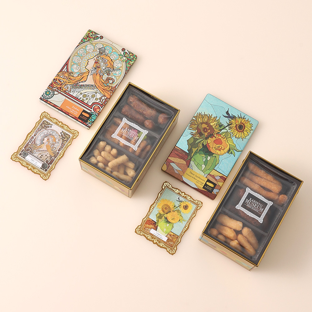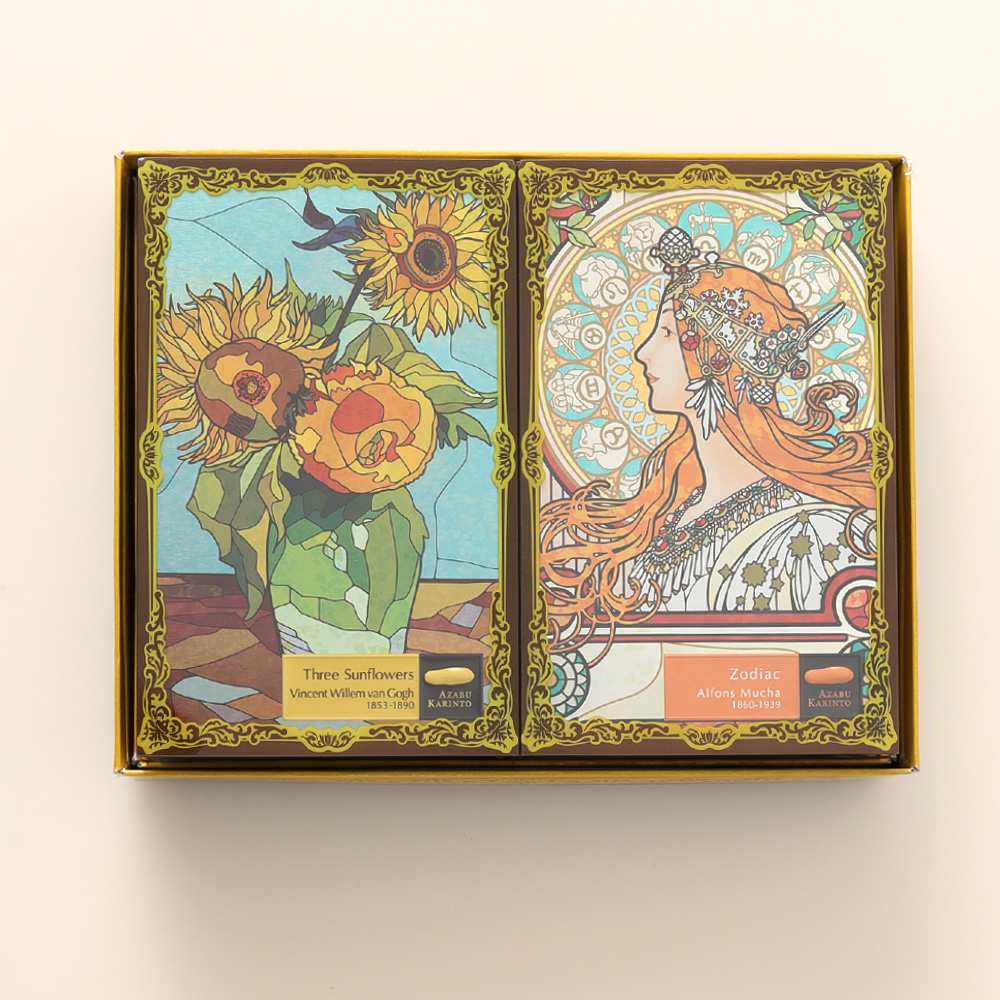 歴史的文化を描いた「KARINTO MUSEUM」。名画をステンドグラス風にオリジナルアレンジした特別仕様の缶で、名画と過ごす「絵になる時間」を母の日の贈りものにいかがでしょうか。ゴッホの「ひまわり」、アルフォンス・ミュシャの「黄道十二宮」2缶セットです。