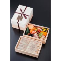 鯛の薄造りを敷き詰めた人気の特製ちらしに、料亭の味の数々を揃えた二段重のお弁当です。