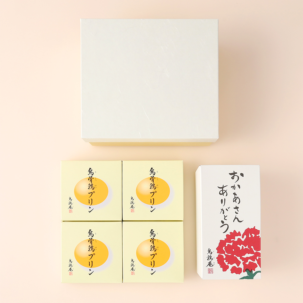 石川県にある烏鶏庵の直営農場で烏骨鶏を飼育しています。その希少な卵を贅沢に使用した「烏骨鶏かすていら」は長らくお客様にご愛顧いただいている烏鶏庵の看板商品です。烏骨鶏の卵ならではの「しっとりした食感と濃厚な卵の味わい」が特徴です。かすていらには母の日限定のカーネーションの焼印入り。感謝の気持ちを届けるパッケージには「おかあさんありがとう」の可愛らしいメッセージを入れてご用意しました。つるんと食べやすい烏骨鶏プリンとの詰合せです。