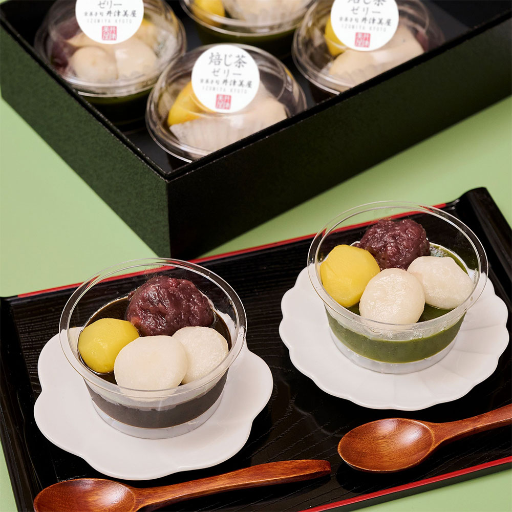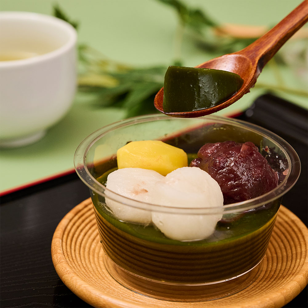 京都の宇治抹茶と宇治焙じ茶を使用した、もちもちの求肥餅、北海道産小豆、栗が入った銘茶ゼリー