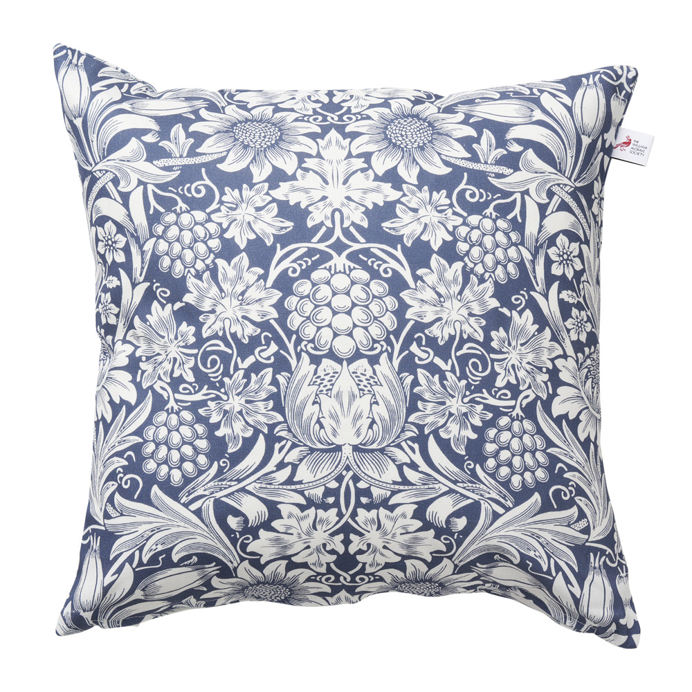 1879年に単色の木版印刷の壁紙として誕生したデザイン「サンフラワー」のコットンクッションカバー。デザイン名のヒマワリに加え、モリスの他のデザインにもよく登場するブドウの蔓、花、葉の鏡合わせで描いたデザイン。単色で表現することでヒマワリの美しさがシンプルに際立ちます。同系色のスローとの組み合わせ使いもおすすめです。