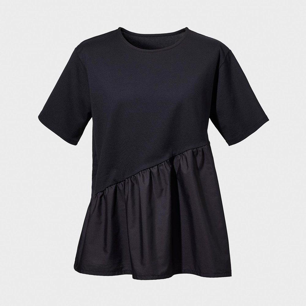 胸下から腰へ斜めに切り替えて、シャツ生地のペプラムをドッキングした触覚的にもデザインを楽しめる一枚。切り替え部分にはギャザーを寄せて、ふんわりとした華やかな雰囲気に。カットソー部分には柔らかな風合いの素材を使用。