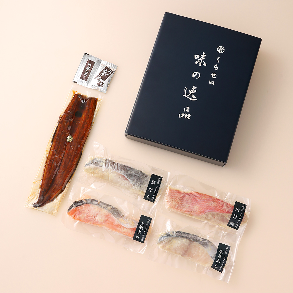 国産うなぎ長焼×1、西京漬(銀さけ・金目鯛・さわら・真だら)各1切