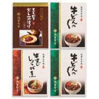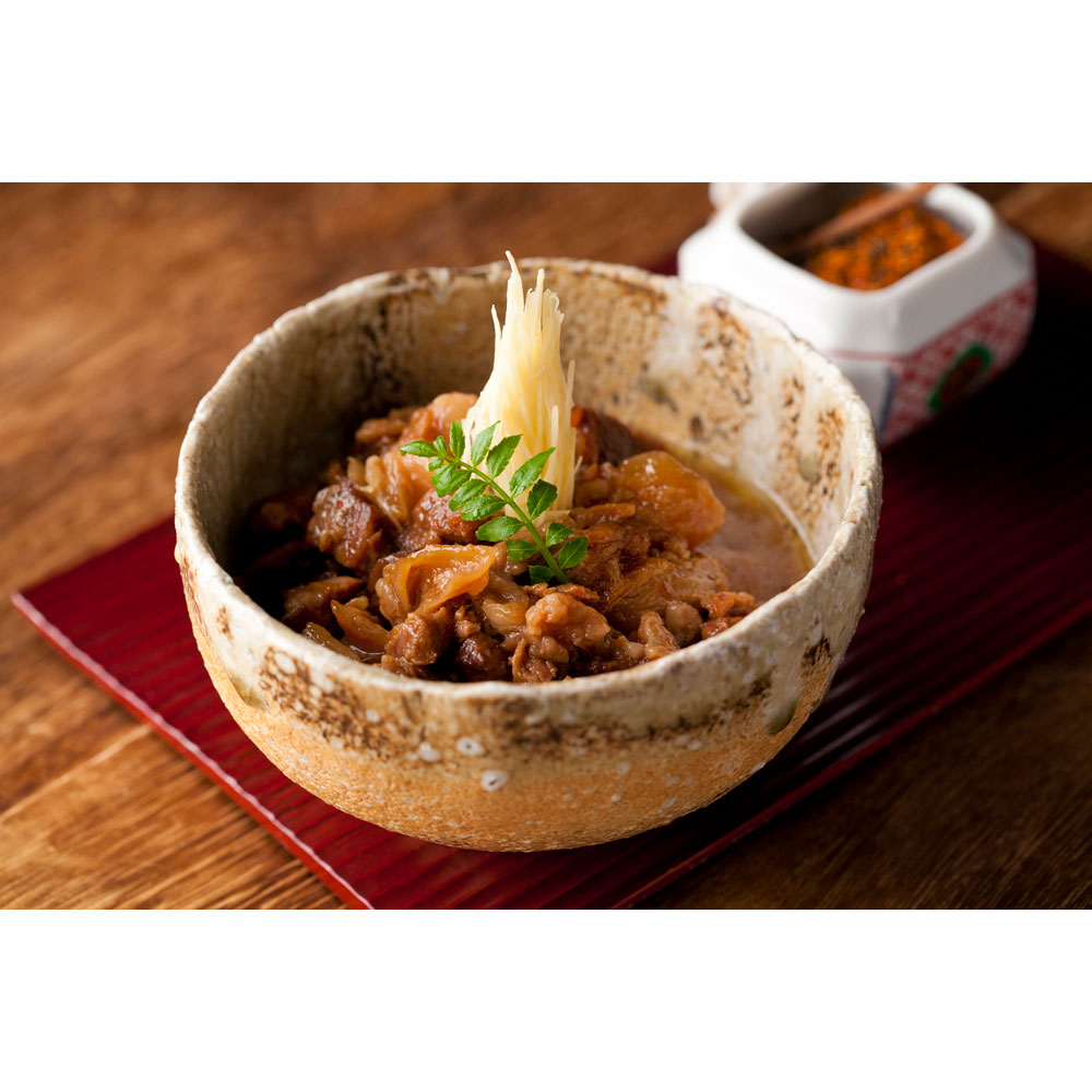 黒毛和牛だし茶漬け(牛肉煮40g×2・だし100g×2)×1、牛すじしょうが煮(150g)×1、牛どんのぐ(牛肉煮70g・こんにゃく煮40g・割下80g)×2
