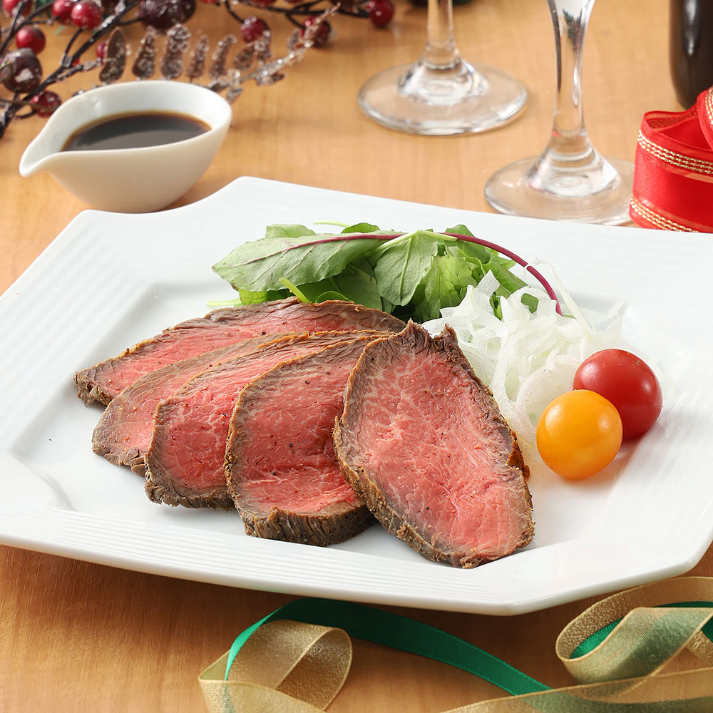国産黒毛和牛のA5・A4等級のみを厳選。さらに部位にもこだわり、希少部位「ランイチ」のみを使用。黒毛和牛の旨味を引き出す独自製法で、熟練の職人が一つひとつ下味を付けて焼き上げています。肉質と製法にこだわり、独自スパイスで肉の味を引き立たせた結果生まれた、“ソースのいらない”ローストビーフ。何も付けずにそのまま美味しく召し上がれます。本当のお肉の旨味をどうぞご堪能ください。冷蔵のままお好みの厚さにスライスしてください。少し常温に戻すと一層やわらかくなります。「2025年度IFFA食肉加工コンテスト金賞」「2024DLGコンテスト金賞」