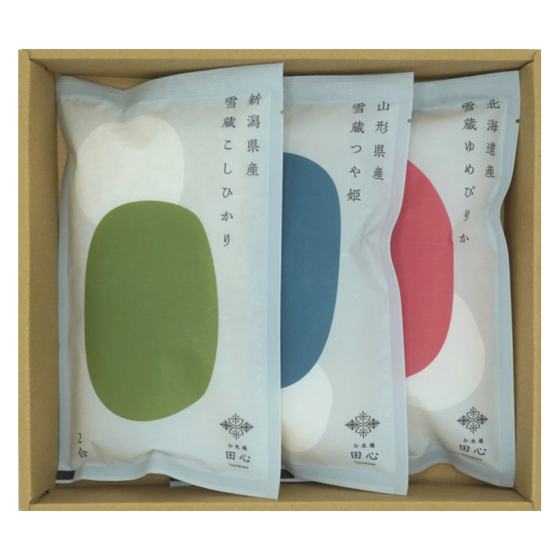 新潟県産こしひかり2合×1、山形県産つや姫2合×1、北海道産ゆめぴりか2合×1