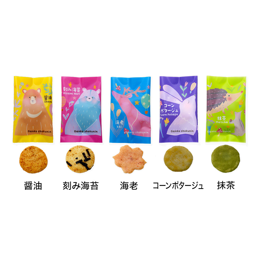 春の暖かな日差しの中、動物たちが集う森の様子を、可愛らしい一口サイズのお煎餅と温かみのある北欧風のイラストで表現した季節限定のプチギフトです。醤油・コーンポタージュ・刻み海苔・抹茶・えびの5種類の味をお楽しみいただけます。※同じ商品を4箱お届けいたします。