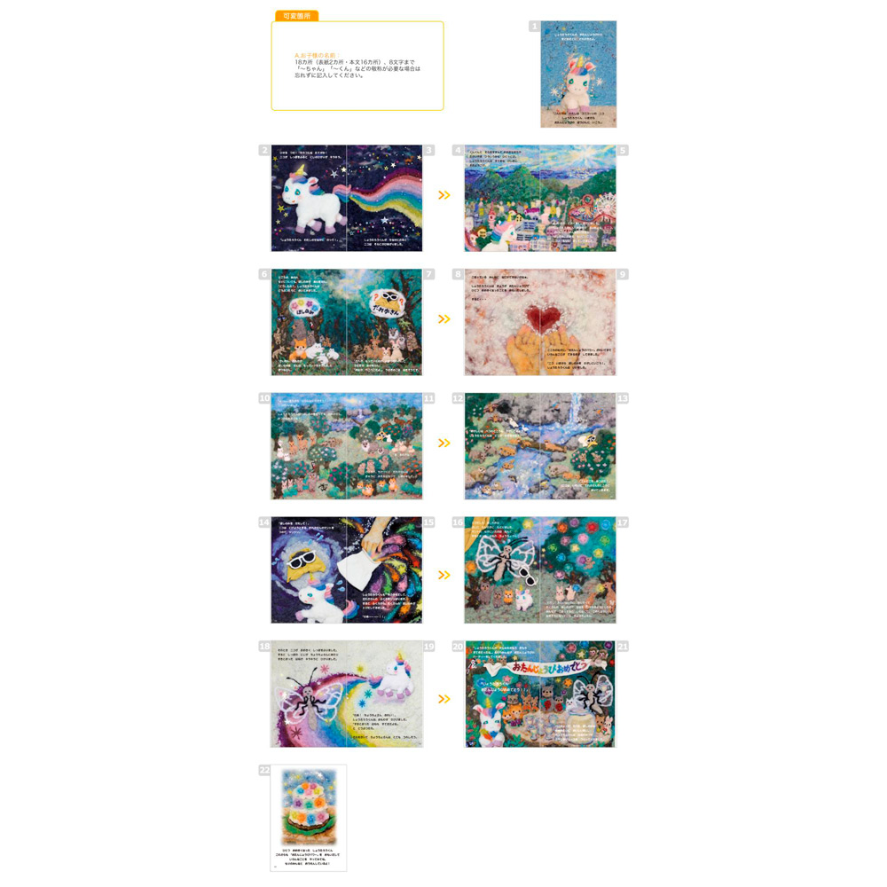 A)お子様の名前:18カ所(表紙2カ所・本文16カ所)、8文字まで(ひらがな、カタカナ、漢字、アルファベットのいずれか)