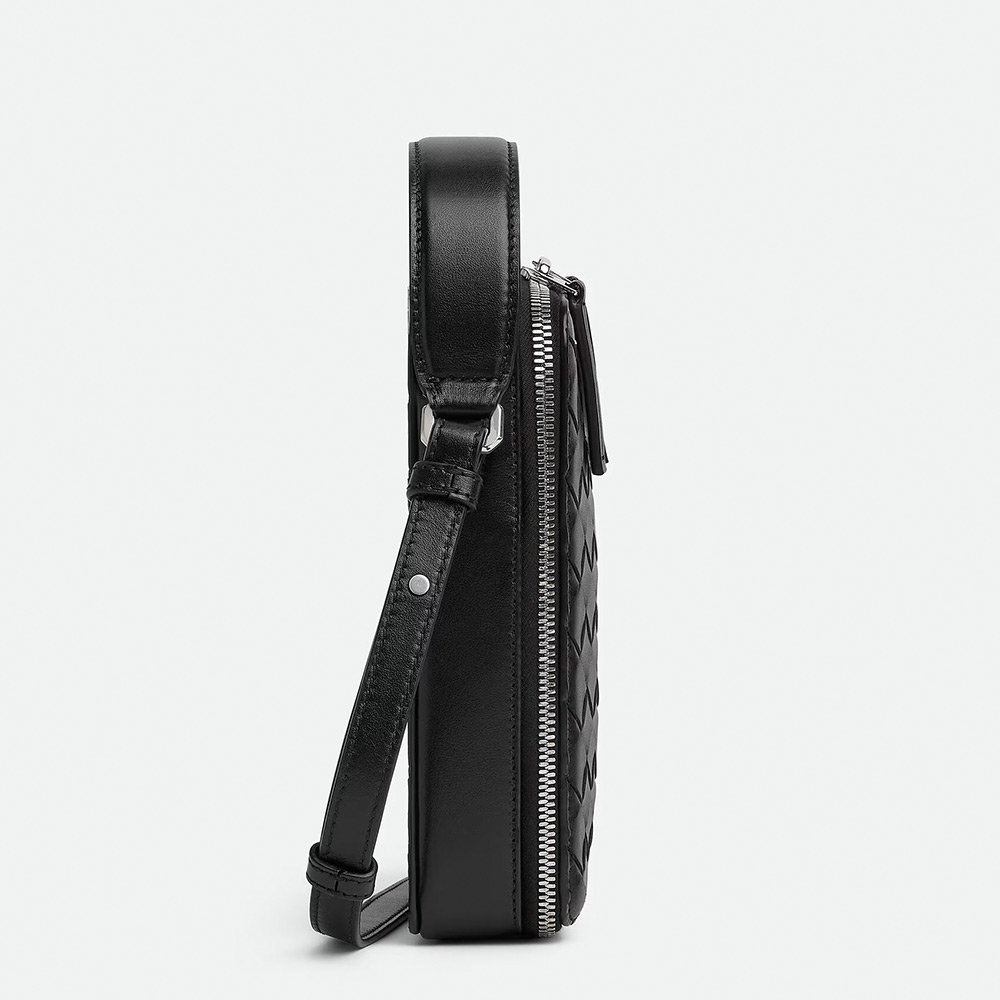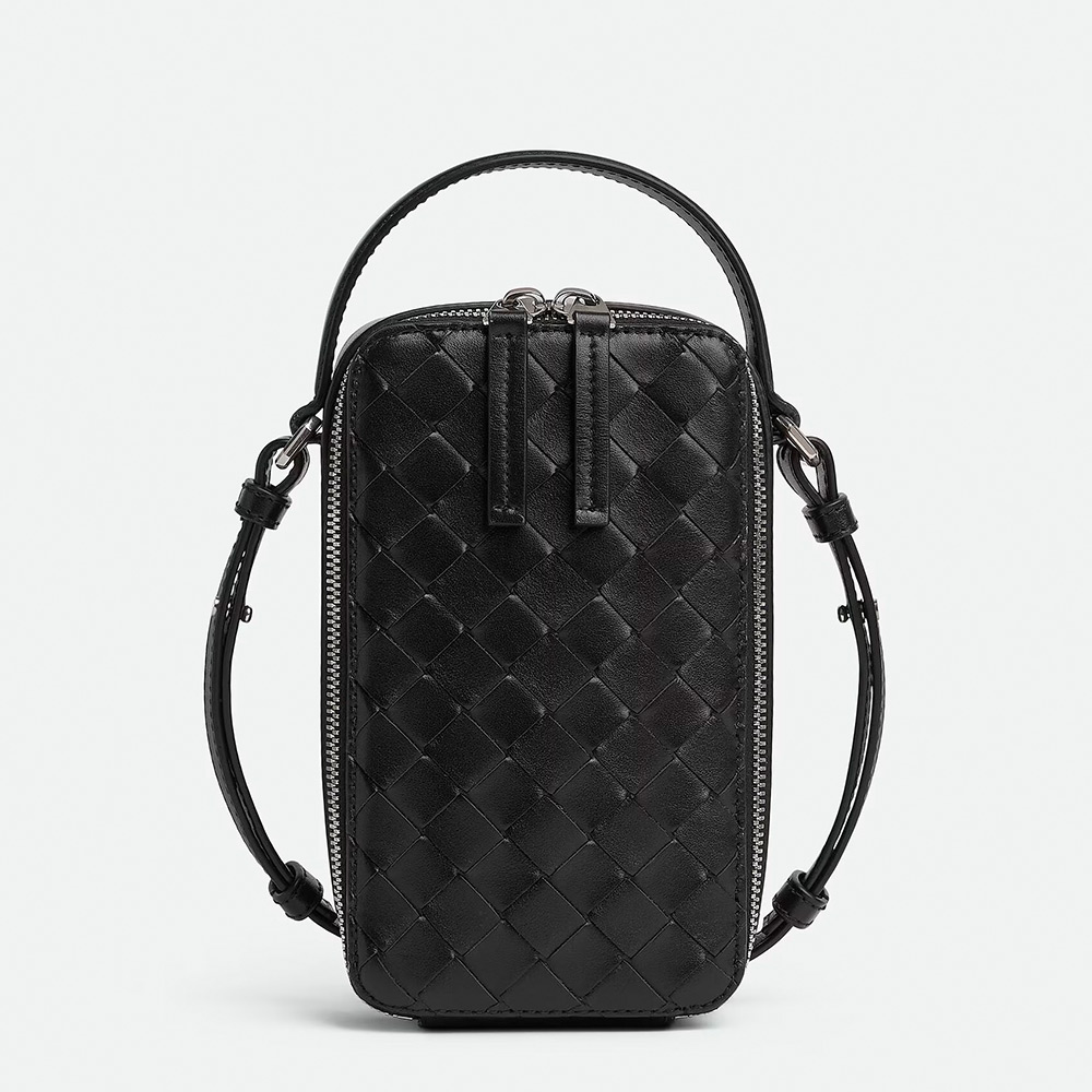 ハンドルとクロスボディストラップが付いた、イントレチャートカーフレザーのフォンポーチです。