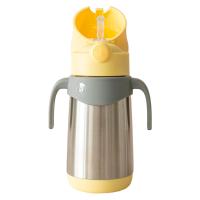 350mlの子供用水筒。3層断熱のステンレス製ボトルで、冷たいものは最長8時間、あたたかいものは最長6時間、温度を保ちます。お出かけにも便利な保冷保温が可能なドりンクボトルです。持ち運びに便利なキャリーハンドルと、ワンプッシュで開くボタン式の蓋が特徴です。飲み口は角度のついたストローで、幅広い年齢の子供たちがくわえやすく、飲みやすくなっています。シンプルなデザインで子供たちだけでなく、親子でも使っていただけます。※専用のハンドルをつけることでより持ちやすくなります。