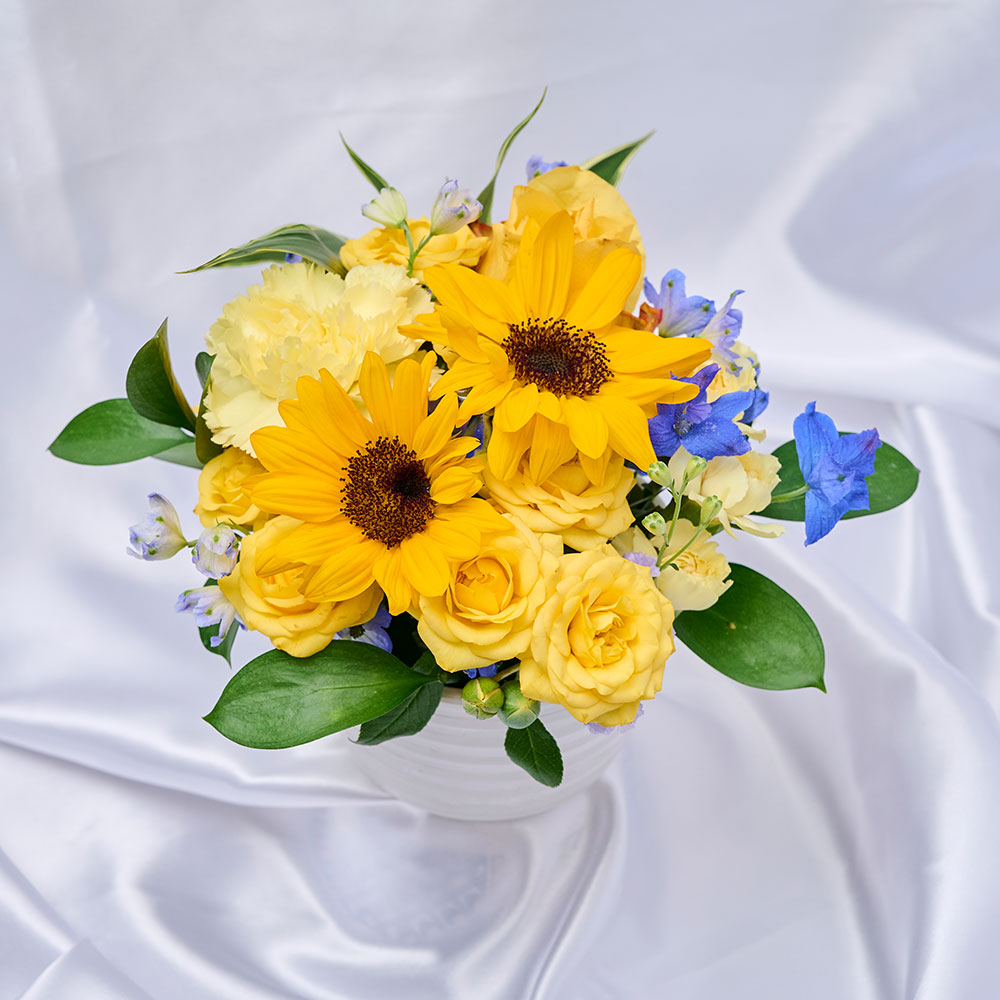 黄色を基調にしたアレンジメント。黄色い花の代表のひまわりを中心に親しみやすい感じに仕上げております。そのまま飾れるアレンジメントなので場所を選ばず、お手入れも簡単です。「レモンケーキ」は老若男女問わずに好まれる焼き菓子。その親しまれる美味しさを大切にしながらも、シェフ・パティシエの手によって進化しています。