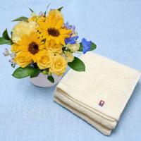 父の日の贈りものに。ひまわりを中心とした親しみやすいアレンジメントと今治産スリムバスタオルのセット