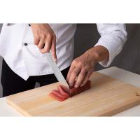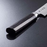 日本が誇る刃物の産地「関」で培われた伝統の職人技と、革新的な技術力から生み出されるマスターライン「関孫六 要(かなめ)」は、関孫六の最高峰シリーズの長く愛用いただける逸品です。高硬度の特殊ステンレス刃物鋼を芯材とした三層鋼は、刃先を薄く仕上げるスキ加工を施すことで、切り込む際の抵抗が少なくなり、さらに洗練された鋭い切れ味を長く体感していただけます。また、日本刀の対象物に効率的に力が加わるという機能性に着想を得て応用された、機能美を兼ね備えた「鳥居反り」の形状に仕上げました。八角柄のこだわりのハンドルは、職人の手で1本ずつ手作業で削ることで、口金とのつなぎ目がほとんど感じられないぐらい滑らかに仕上げられています。「切付6寸半(195mm)」は、十分な刃渡りと刃幅があり、日常使いに加え、手の込んだ料理でも真価を発揮する1本です。刺身やローストビーフなどの崩れやすい食材も、断面まで美しく仕上げることができます。
