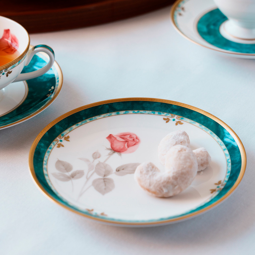 16cmプレートは取り皿や小さめのケーキプレートととして活躍する場がたくさんあります。 健やかに成長するバラを1輪切り取ったようなデザインは、余白の美しさを生かし、小さめのお菓子を絵画のように並べてみても面白いかもしれません。