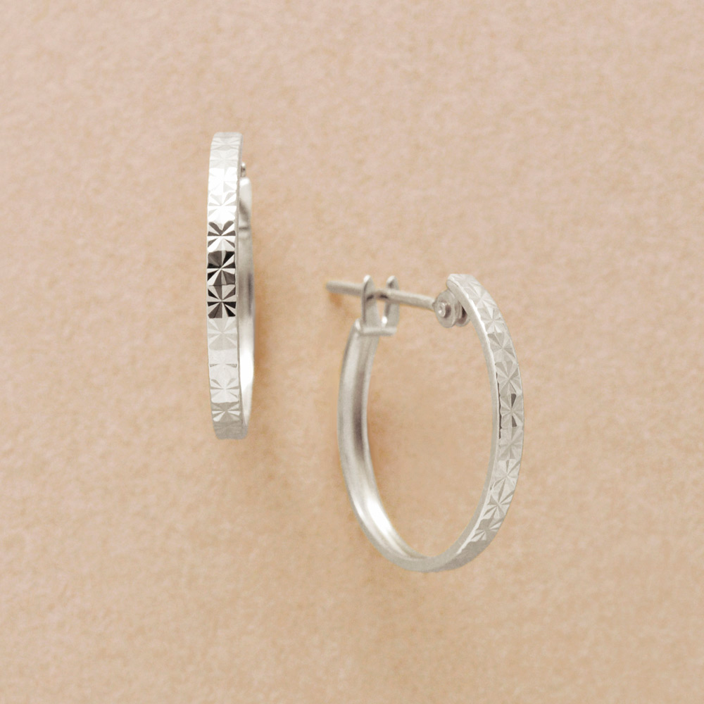 縦横斜めに入れたカットが可憐な小花模様を刻む素敵なデザインです。細身のフープですが、光が多方向に反射するので華やかに煌めきます。外径は約15ミリ。どなたにも着けやすい程よいサイズ感です。