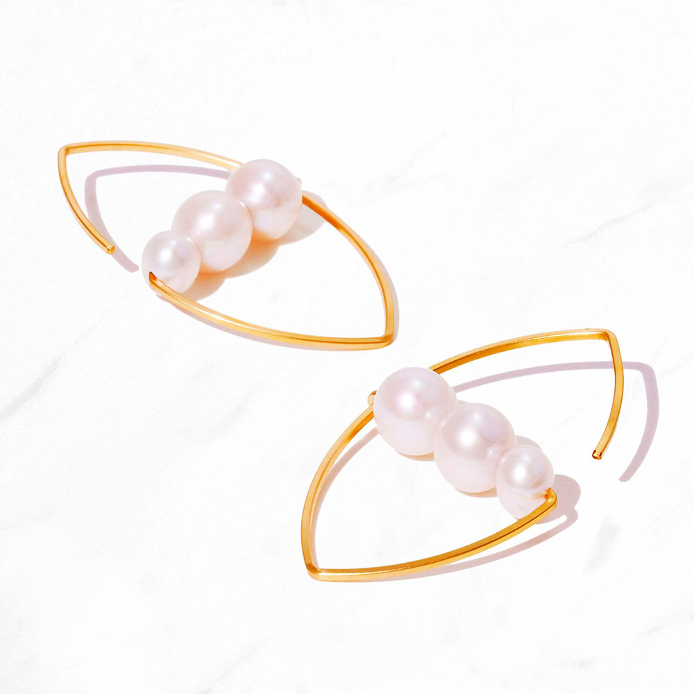 艶やかな淡水パールがきっちりと3ピース並んだ姿が特徴的なフックタイプのピアス。シンプルな構造ながら、耳につけると様々な方向に走る地金のラインとパールの丸みが立体感を生みだします。洗練された佇まいが魅力的なアイテムです。